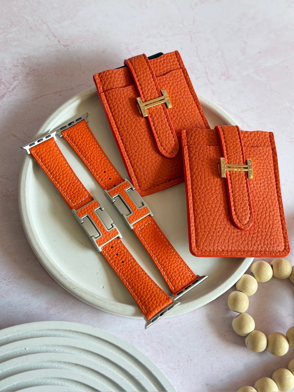 بند اپل واچ چرمی هرمس نارنجی با قفل طرح هرمس (306)